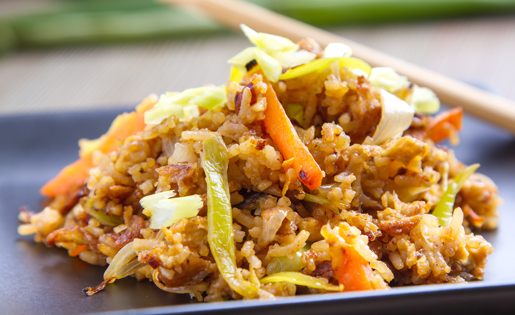 Dáme zbytek oleje s cibulí a za stálého míchání smažíme tak 2-3 minuty, pak česnek smažíme cca 30 sekund, dále rýži (ideálně aby byla suchá a nelepila se), promícháme. Mícháme tak dlouho dokud se to lehce neosmaží 2-3 minutky.